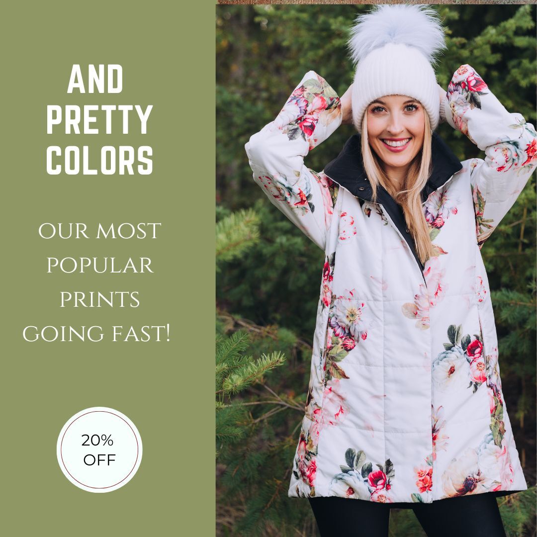 Our coats are colorful or not. Each print reverses to black giving you two stylish options. Luxuriously soft, flattering for all sizes and complete with deep zippered pockets and adjustable shaping.